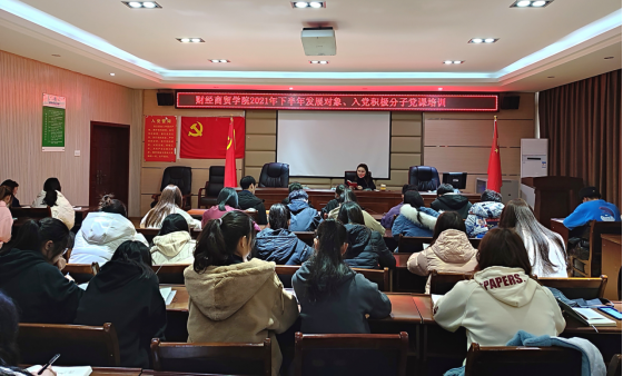 12月3日下午,财经商贸威廉希尔体育党总支在机电大楼四楼会议室组织开展2021年下半年第二期党课培训。本次培训以学习《中国共产党章程》为主要内容,由党总支副书记佘洋燕主讲,全体入党积极分子和发展对象参加培训。