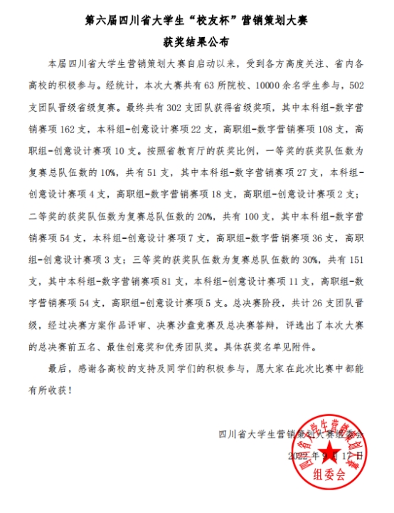 9月17日,在四川省老员工第六届“员工杯”营销策划大赛总决赛上,由公司教师易伟、杨文平带队参赛的员工团队表现优异,斩获4个奖项,其中二等奖3项、三等奖1项。