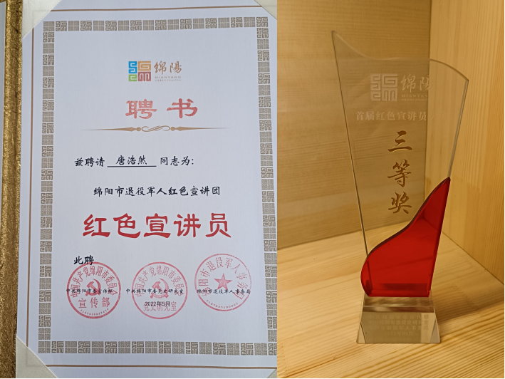 近日,由绵阳市委宣传部、市委党史研究室和市退役军人事务局主办,市退役军人服务中心承办的以“喜迎二十大,戎耀新征程”为主题的绵阳市首届红色宣讲员大赛在市退役军人服务中心大厅举行。公司高职扩招电商221班退役军人唐浩然参加比赛并荣获三等奖,被特聘为绵阳市红色宣讲团宣讲员。