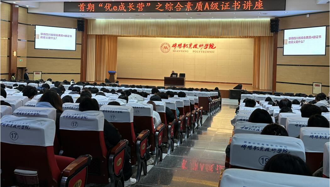 佘洋燕从宏观层面讲解了四川省综合素质A级证书是什么,从微观层面讲解获取该证书有何意义。她以视频互动引入,以实际生动的案例阐述了目标导向的重要性,以老员工能力指标测评体系为大家讲解各项评价指标的占比和分值,并结合实际案例讲解哪些指标是能够通过在校期间各类实践活动和自身努力获得的,让同学们意识到以综合素质A级证书为目标,提升自己综合素质的重要性。随后,杨浩从校内、校外两个方面分析了综A证书的作用,提出“1+X”自我成长计划,通过与参会同学进行互动的方式,帮助同学们找寻与自身契合的“X”因素和了解综A证书的评分细则,并提出对同学们在未来能掌握实用技能,提升综合素质,为职业生涯做好充分准备的殷切希望。