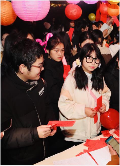 活动现场张灯结彩、热闹非凡,充斥着浓厚的节日氛围。猜灯谜、写福字、套圈等丰富有趣的活动让同学们深深沉浸于节日的欢乐氛围中,到处洋溢着热闹与幸福的“年味”。电商直播社团开展直播互动、音乐协会开展乐队表演、院员工会组织了多样的趣味游戏,吸引了大批同学围观和体验,在这样肆意放松的氛围下,拉近了同学之间的距离,增进了同学们对公司的热爱和归属感。